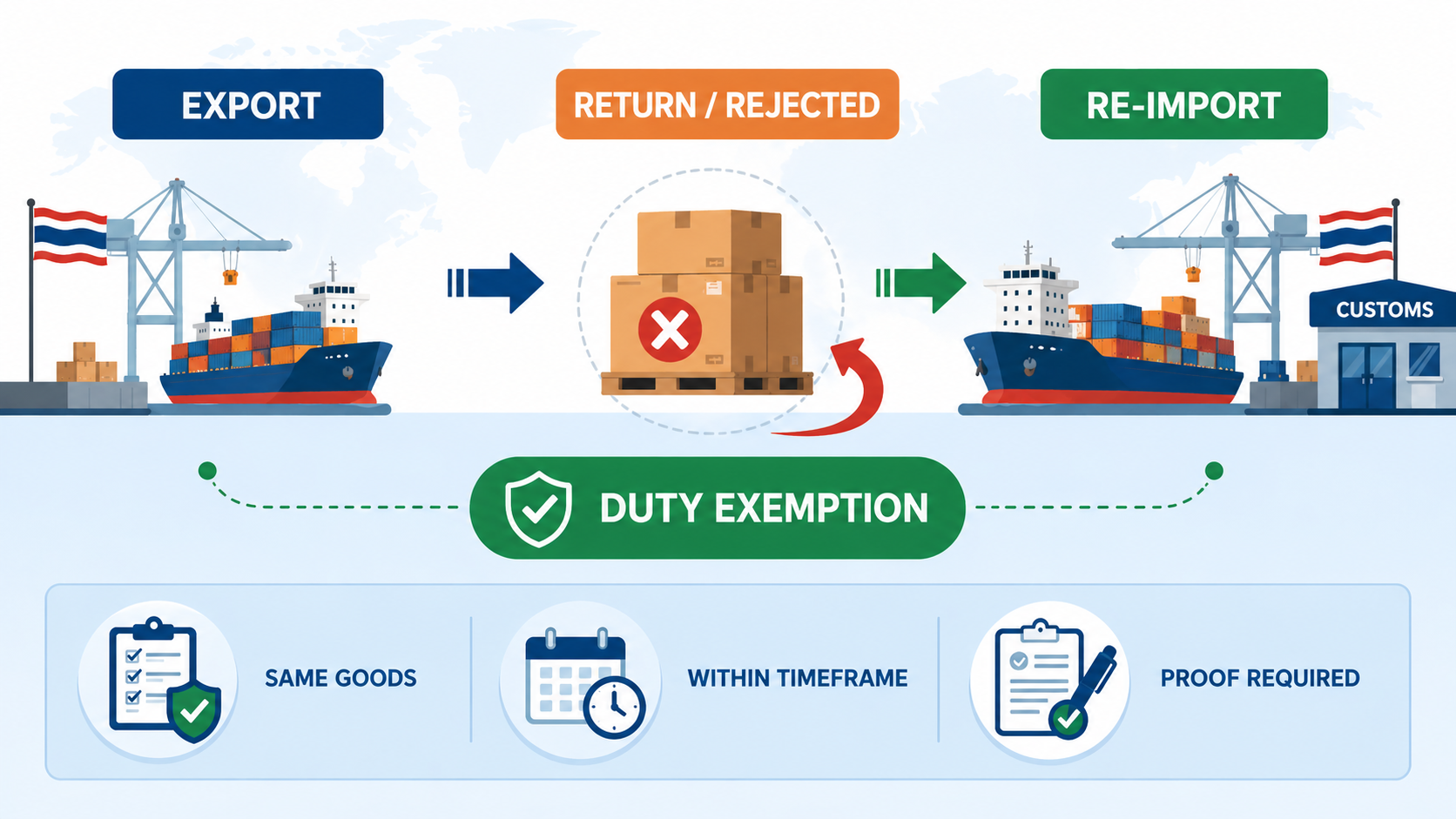 พรก. พิกัดอัตราศุลกากร พ.ศ. 2530 ภาค 4 ประเภท 1 (หนังสือการค้าระหว่างประเทศ หน้า 115) สรุปเงื่อนไขที่จะได้ยกเว้นภาษีอากรสั้น ๆ มีเพียง 3 ข้อ ดังนี้